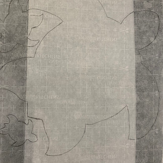 First, I drew the silhouette lightly with a pencil to have a basic design started. I used two layers 80/20 Hobb's Batting, one black and one natural to provide loft. My silhouette was drawn then traced onto parchment paper. I used misty fuse to adhere it to the black batik fabric and then cut out the turtle silhouettes. I then placed the turtles on top of the green fabric. Using the manufacturer's instructions, I adhered the black to the green fabric.