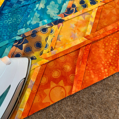 I used six fabrics in my sequence. After each strip was sewn together, I pressed them to form a six diamond unit. I continued to do this to form my pattern for my star sections.